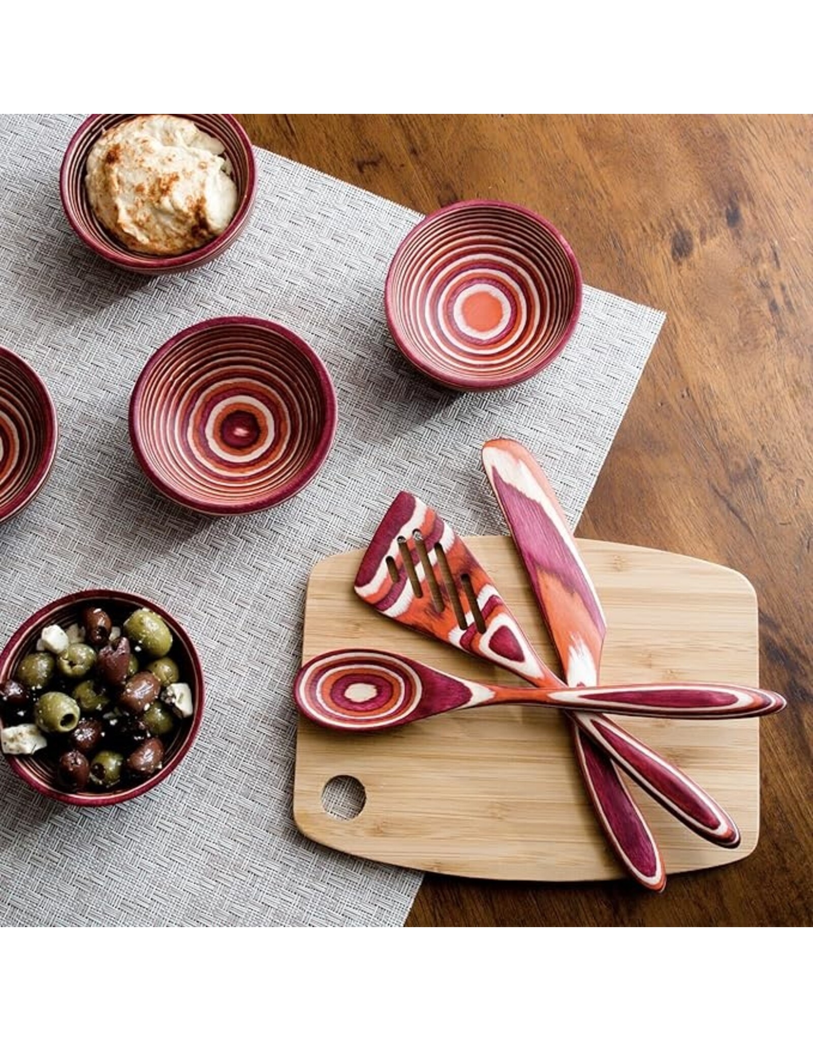 These wood utensils are made with 100% pakka wood. Layers of food safe, colored material make up these unique wood kitchen tools. Care instruction: hand wash only. Fda approved. Approved for heat up to 450 degrees.