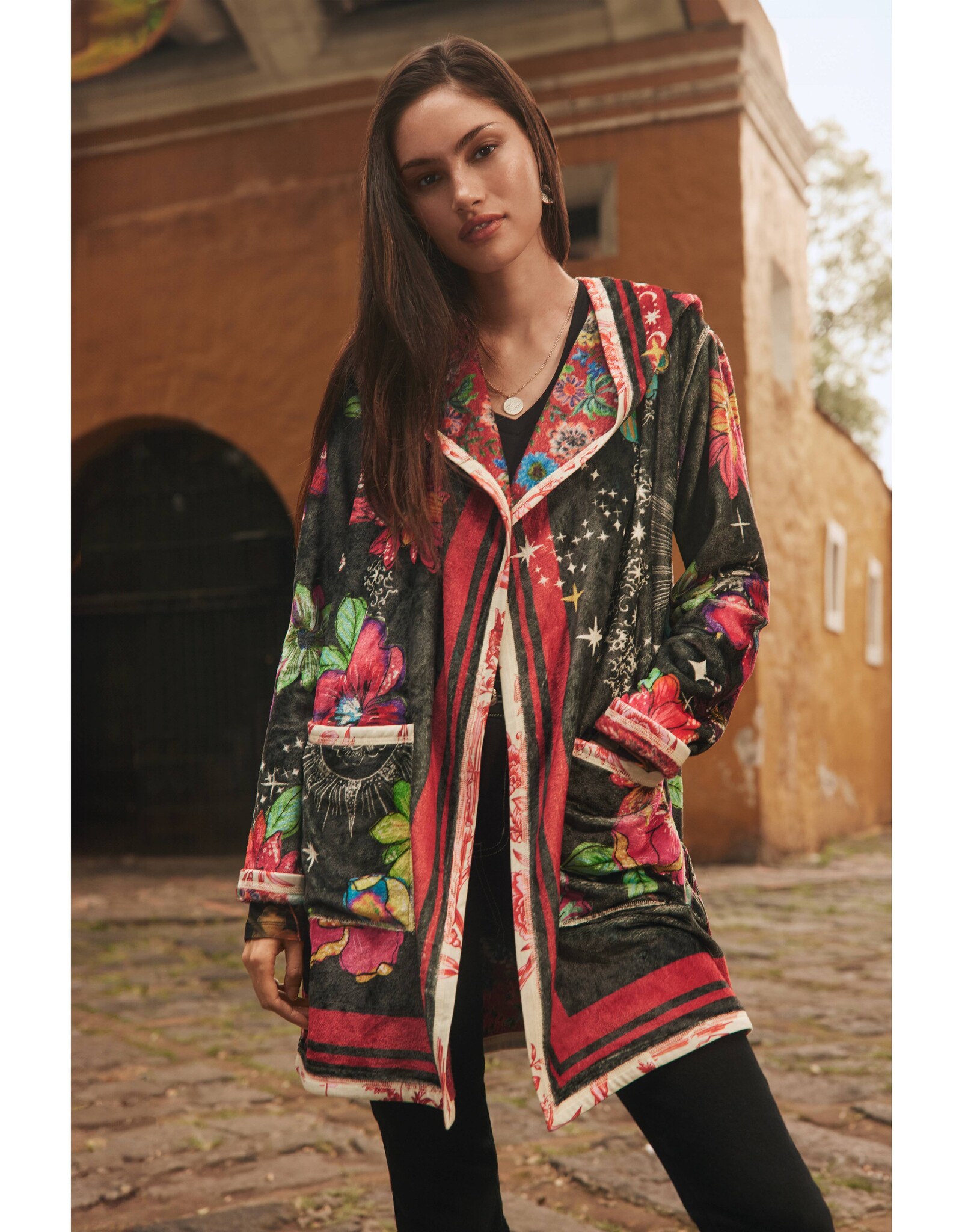 Washed in brilliant floral bouquets, the Joan Midi Sherpa Jacket is equal parts cozy and versatile. Featuring two unique designs, this fully reversible jacket offers an open front with an attached hood and functional patch pockets. Layer over a coordinating pullover and pair with wide-leg jeans for an elevated casual look.